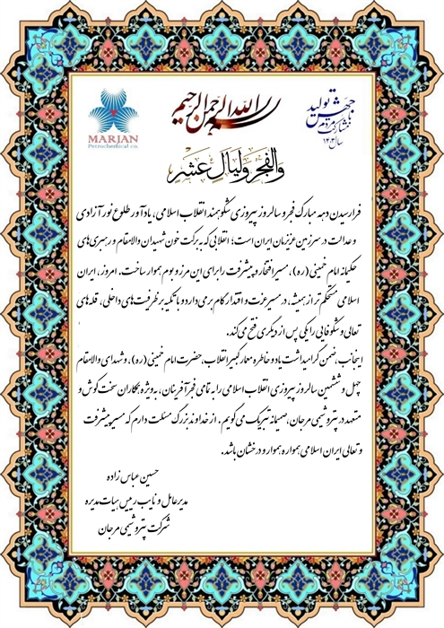 اینجانب، ضمن گرامیداشت یاد و خاطره معمار کبیر انقلاب، حضرت امام خمینی (ره)، و شهدای والامقام، چهل و ششمین سالروز پیروزی انقلاب اسلامی را به تمامی فجرآفرینان، به‌ویژه همکاران سخت‌کوش و متعهد در پتروشیمی مرجان، صمیمانه تبریک می‌گویم. از خداوند بزرگ مسئلت دارم که مسیر پیشرفت و تعالی ایران اسلامی همواره هموار و درخشان باشد.